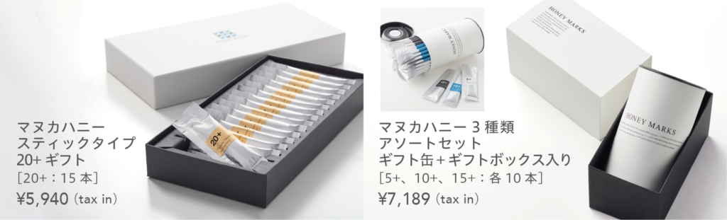 そこで、新しいアイテムとして、最高グレード[20+]のマヌカハニースティックが15本入ったギフト(5,940円)と、特選を受賞したアソートギフトの倍量で3種類のマヌカハニーが各10本ずつの30本入ったギフト缶(7,189円)も今年はご用意しました。